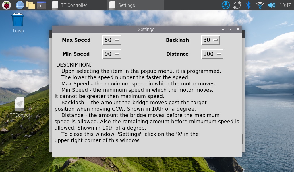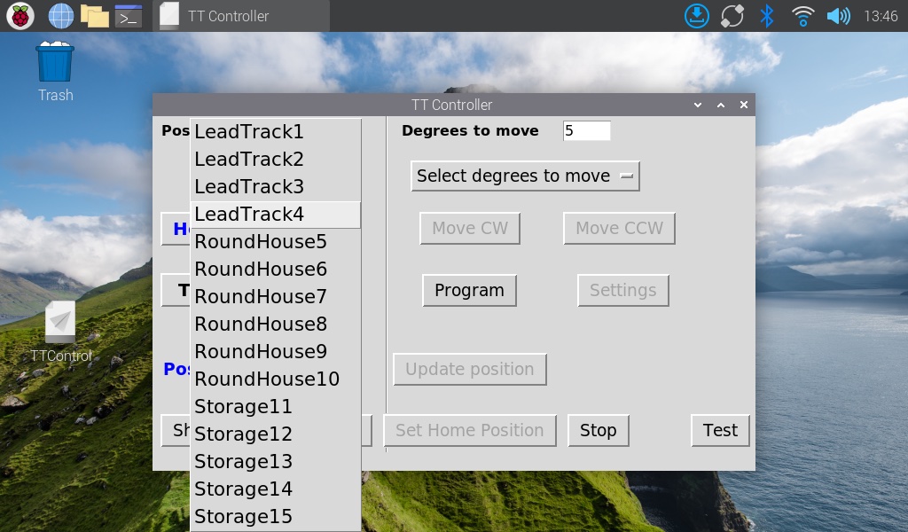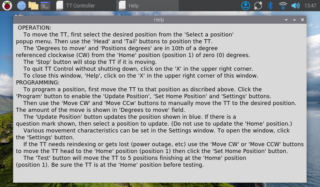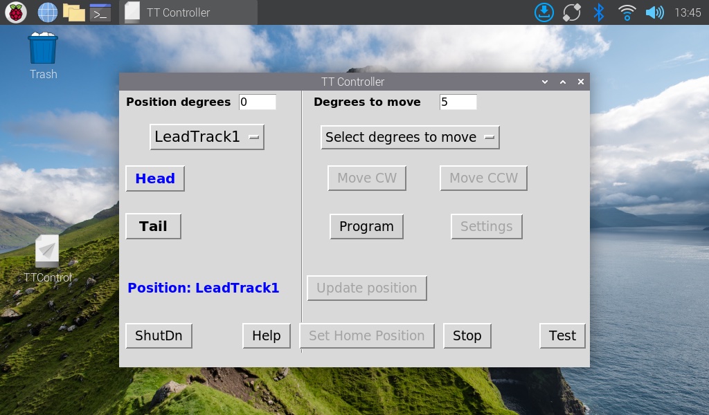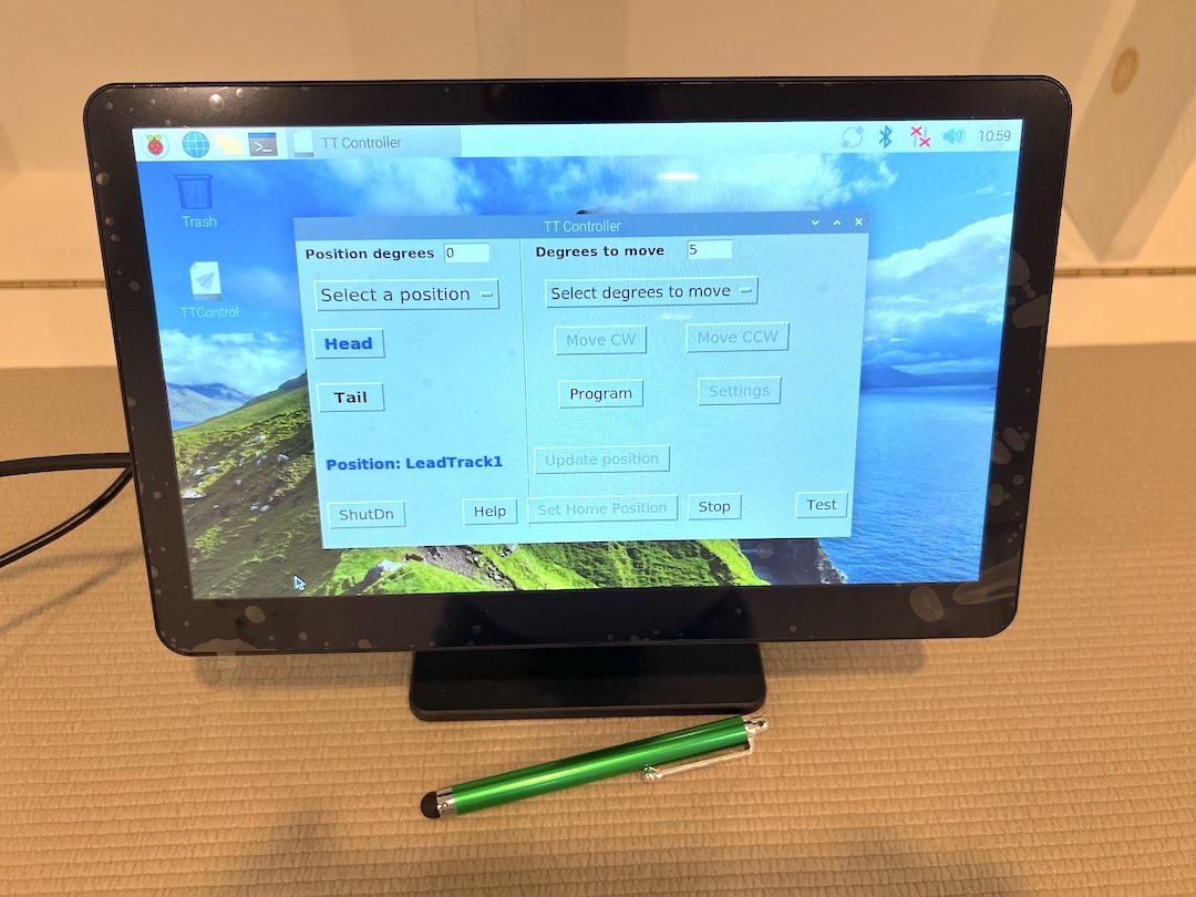 TT Controller window.Screen showing ‘Select a position’ popup menu.Screen showing the Help window.Screen showing the Settings window.The 10″ touch monitor. Shown on a stand but can be laid flat. Also 7″ touch monitor is available.Back of 10″ monitor showing HDMI and 5V+TOUCH cables connected.