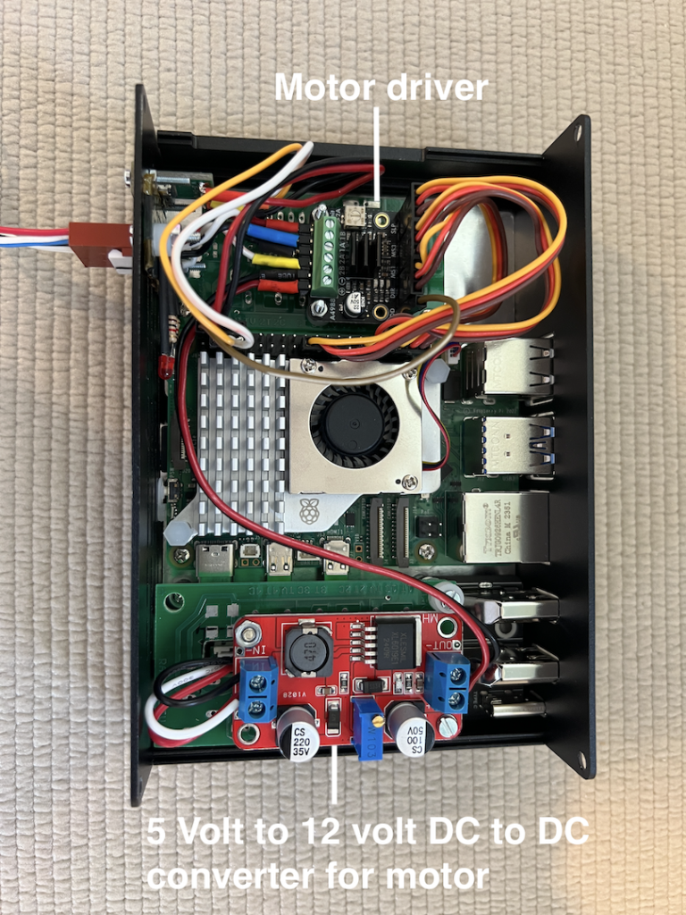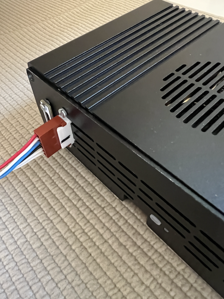 Control box showing motor and other connectors. The MicroSD Card holds the control software and can be replaced if required. If mounted vertically, the ventilation slots should be on top i.e. this side up.Control box showing power and other connectors.Control box front showing cables.
